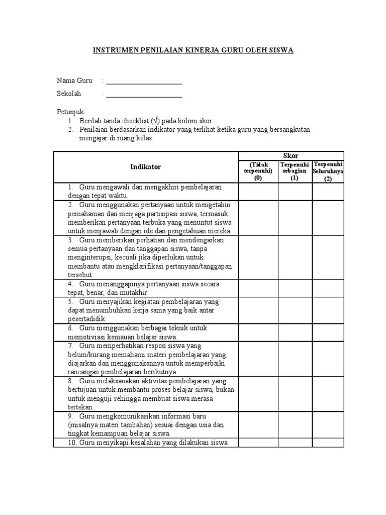 Berikut ini contoh angket penilaian siswa terhadap guru di sekolah. Instrumen penilaian kinerja guru oleh siswa. No nama siswa tanggung disiplin kerapihan total nilai ket. Dalam menerapkan penilaian otentik, capaian belajar siswa sebaiknya tidak hanya. Dalam penilaian autentik, keterlibatan siswa sangat penting.